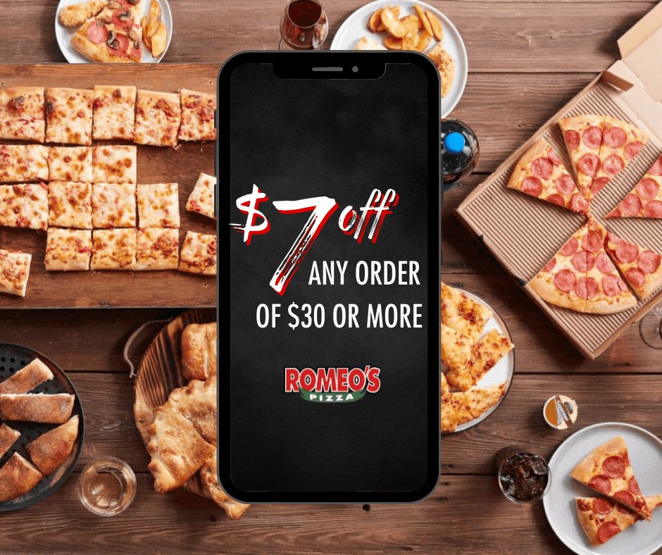 Romeos Pizza Deals, Discounts and Coupon Codes Today only: Get $7 on Orders Over $30. Valid until further notice. ONL7 Show Coupon Code. $3. coupon. Coupon promo code for $3 Off Orders Over $15. Valid until further notice. ONL1 Show Coupon Code. $4.