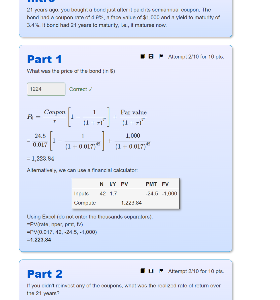 Coupon rate calculator for bonds. How To Find Coupon Rate Of A Bond On Financial Calculator How to Calculate Coupon Rate of a Bond On A Financial Calculator: The coupon rate is the interest that a bond pays per year, divided by the bond's face value. For example, if a bond has a face value of $1,000 and pays a coupon rate of 5%, then the bond will pay $50 in interest each year. › calculate › bondBond Calculator (P. Peterson, FSU) The purpose of this calculator is to provide calculations and details for bond valuation problems. It is assumed that all bonds pay interest semi-annually. Future versions of this calculator will allow for different interest frequency. Treasury Return Calculator, With Coupon Reinvestment - DQYDJ The calculator assumes bonds are bought at face value with no transaction fees and a tax rate of 0%. Since we only have a 10-year yield number, we had to take some liberties when calculating bond prices - we properly compute dirty and clean prices of the bonds, but we are assuming that bonds are sold at the 7 year mark asking for the 10 year yield. How to Calculate the Bond Duration (example included) Therefore, for our example, m = 2. Here is a summary of all the components that can be used to calculate Macaulay duration: m = Number of payments per period = 2. YTM = Yield to Maturity = 8% or 0.08. PV = Bond price = 963.7. FV = Bond face value = 1000. C = Coupon rate = 6% or 0.06. Additionally, since the bond matures in 2 years, then for ...